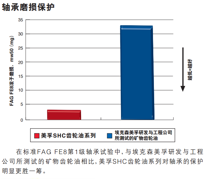 美孚SHC齿轮油系列产品采用先进的添加剂专利技术,设计为工业用齿轮箱提供针对胶合等各种磨损类型的杰 出的耐磨保护,并且具有高级的防微点蚀疲劳性能。此外,与埃克森美孚研发与工程公司所测试的矿物齿轮润滑油 产品相比,美孚SHC齿轮油系列能为齿轮箱的滚动元件轴承提供更好的润滑。美孚SHC齿轮油系列产品具有优秀 的防锈和防腐蚀性能,即使在湿润的环境中也不会有导致精滤清器堵塞的趋势。同时,在高温环境下,美孚SHC齿轮油 系列产品具有优异的黑色金属及有色金属相容性能。